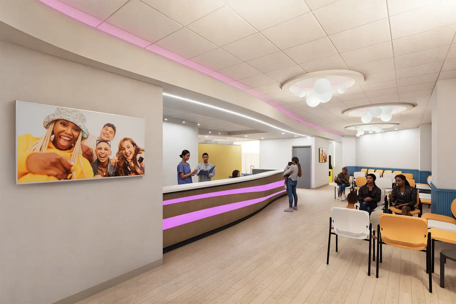 Triad Kids Dental is a vibrant pediatric clinic designed to make young patients feel comfortable and welcome. Bright accent lighting, playful murals, and colorful furnishings create an energetic and engaging environment throughout. The space includes an open bay for treatment, glass-enclosed consultation rooms, and a cheerful reception area with a curved front desk and ample seating. A well-organized sterilization zone supports daily operations, while the overall layout promotes easy flow for both staff and families.